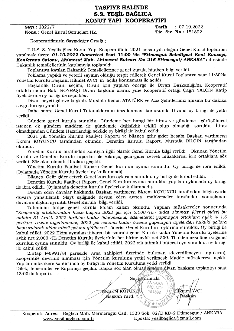 2022 Genel Kurul sonuçları - Tasfiye Halinde S.S. Yesilbaglica Konut Yapı Kooperatifi - UNREGISTERED VERSION